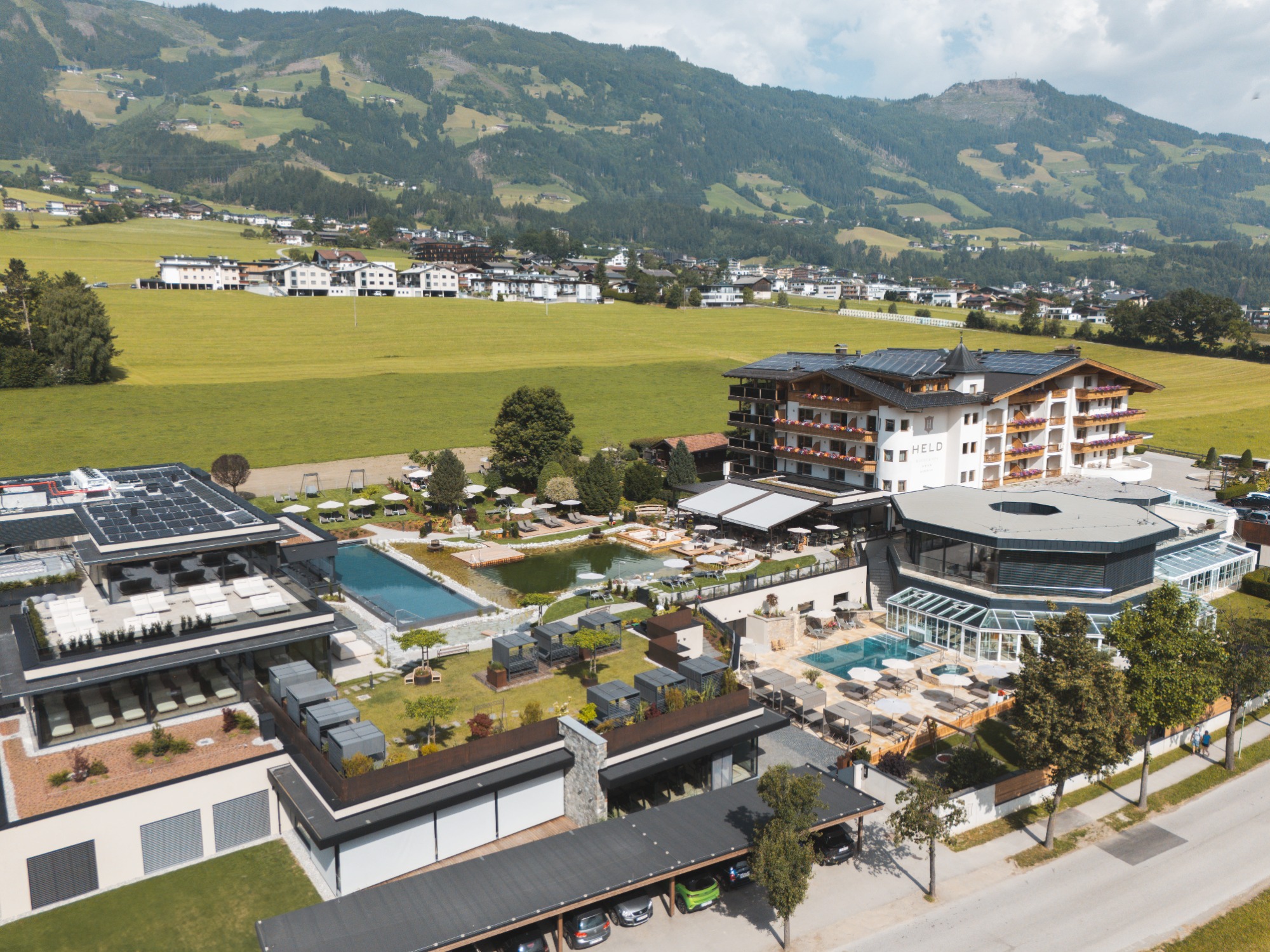 Das Hotel Held selbst liegt in schöner Lage am Orstrand von Fügen im Zillertal, umrahmt von Wiesen und Feldern. Um von diesem Tiroler Wellnesshotel zu Sehenswürdigkeiten oder zu den Liften und Bergbahnen der Zillertaler Skigebiete zu gelangen, ist ein Auto von großem Vorteil. Es gibt allerdings einen hoteleigenen Shuttle-Service zu den Skiliften, siehe „Service“.